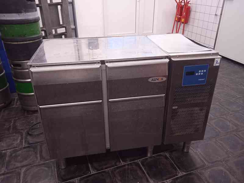 Chladící stůl - 4 x šuplíky z kuchyně, kde byl součástí bloku. Velmi kvalitní provedení, značka stolu ALNOX, přední výrobce chlazení F.R.C., z Itálie. Rozměr: 1200 x 700 x 850 mm; zásuvky: 30x53x15 cm; 30x53x37 cm; obsah 263 L; r.v. 2012; plyn: R134A; výkon 0,41 kW; 230 V. Použité, v dobrém stavu, plně funkční. Původní cena: 79.990,- Kč bazarová cena 19.990,- Kč. (kód: 141123-01)