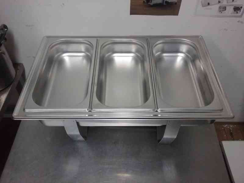 Chafing Dish na rauty, oslavy, catering - sestava: 3 x gastro nádoba 1/3, nádoba na palivo, 1 litr gel. Jednoduchý a moderní chafing dish EKO; rozměr DxŠxH: 60,5 x 36 x 24 cm, obsah 3 x 2,5 litry; další možnosti na vyžádání. Cena: 1.690,- Kč vč. DPH + doprava. (kód: S436110-3P)