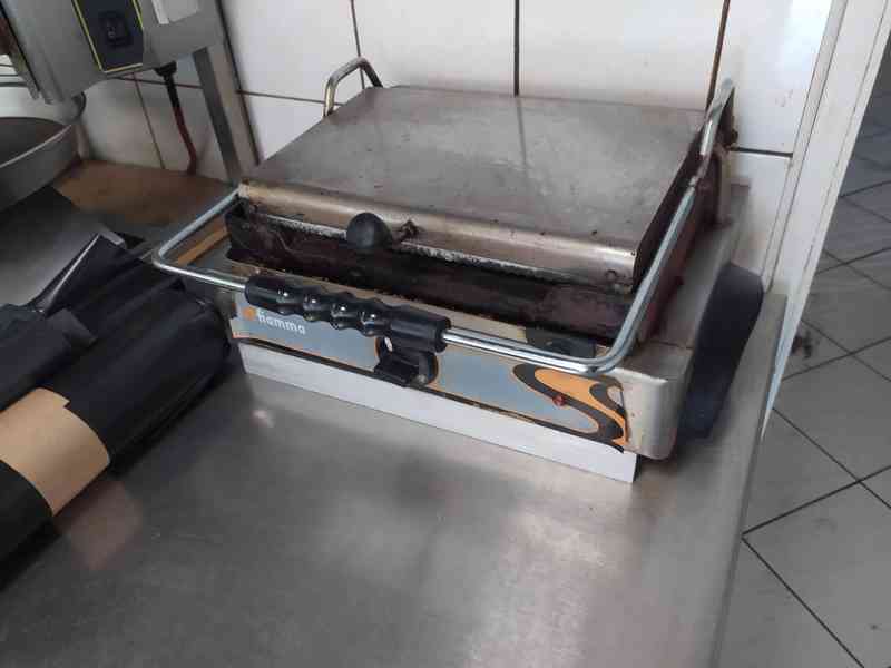 Kontaktní gril použitý, z malého bistra, funkční. Značka Fiamma; spodní plocha hladká a horní plocha vroubkovaná, litinová grilovací plocha. Přípojka 230 V, výkon 3000 W, typ GR 6.1L. Běžná cena: 11.990,- Kč, bazarová cena: 1.490,- Kč + doprava. (kód: I-062101)