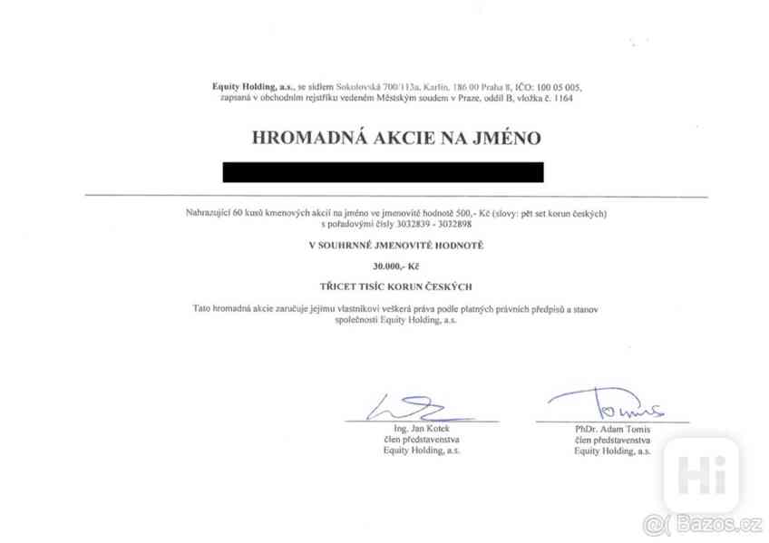 Nabízím k prodeji 60 ks listinných akcií společnosti Equity Holding, a.s. . Převod proběhne řádným rubopisem a kupní smlouvou. Předání možné osobně v Praze. V případě zájmu mě kontaktujte na spaenator.et.gmail.com