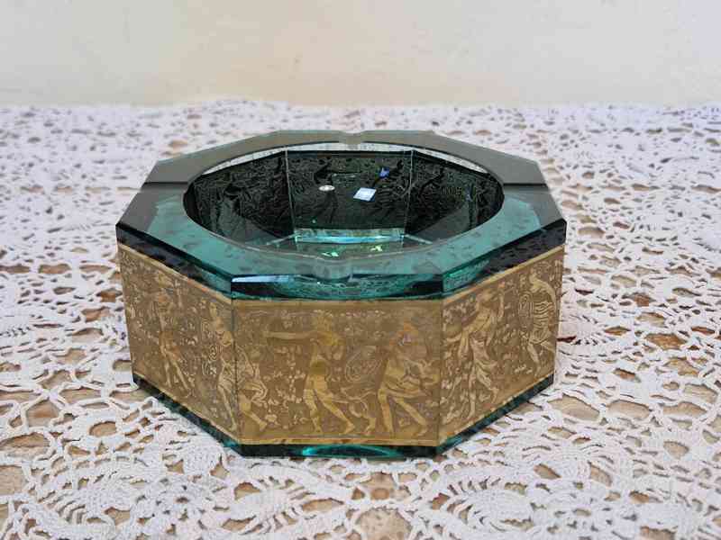 Luxusní masivní broušený s oroplastikou, vzácná barva tmavě zelená až lehce tyrkysová, značeno zespodu Moser v oválu, špičkový stav, 2 třetina 20 stol.