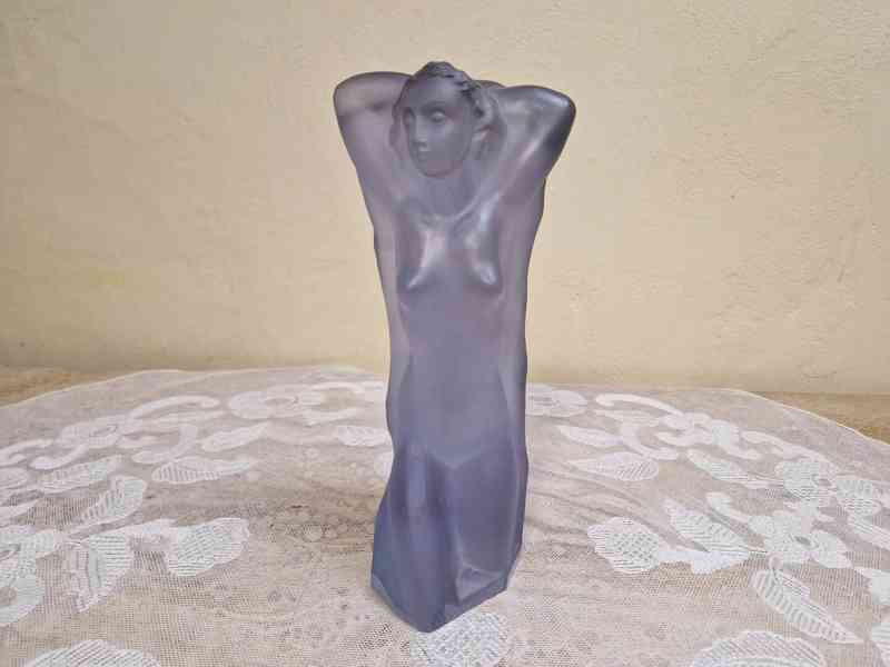 Krásná Art Deco figurální plastika z matovaného alexandritového skla, Ena Rottenberg - Curt Schlevogt. Jablonec, model 1937.