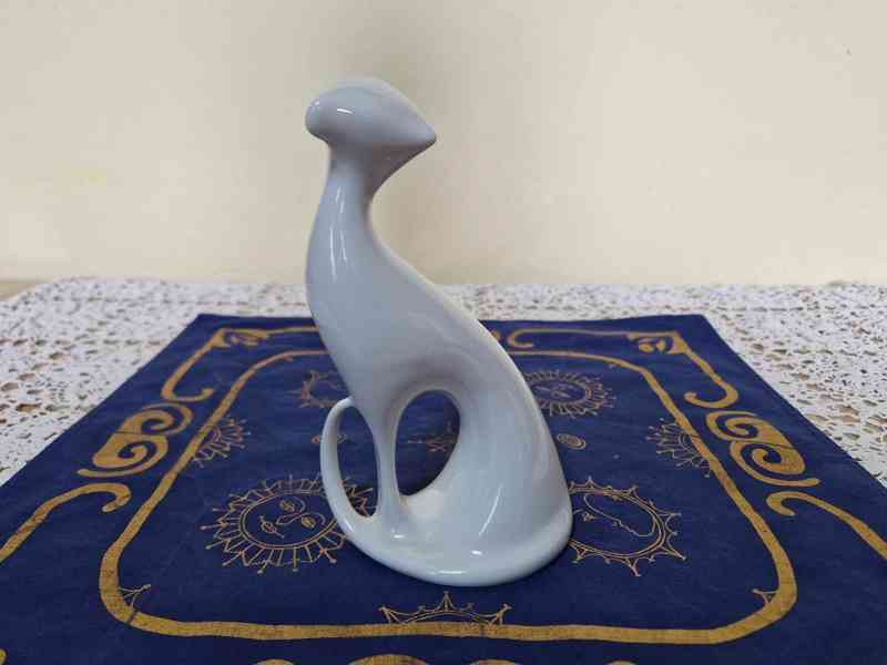 Bílá porcelánová plastika, Sedící Kočka, Expo 58, styl Brusel - Jaroslav Ježek, Royal Dux, původní kus z počátku šedesátých let 20 stol.