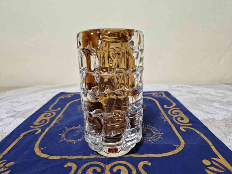 Váza, čiré a hnědé hutně zpracované sklo, plastický reliéf - František Vízner, Škrdlovice, značeno etiketkou,1968.