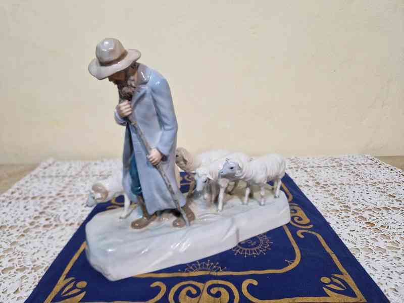 Krásné malované masivní sousoší, Pasáček s beránkem a ovcemi - Royal Dux, návrh Kuhnert, signováno na soklu, kolem 1937.