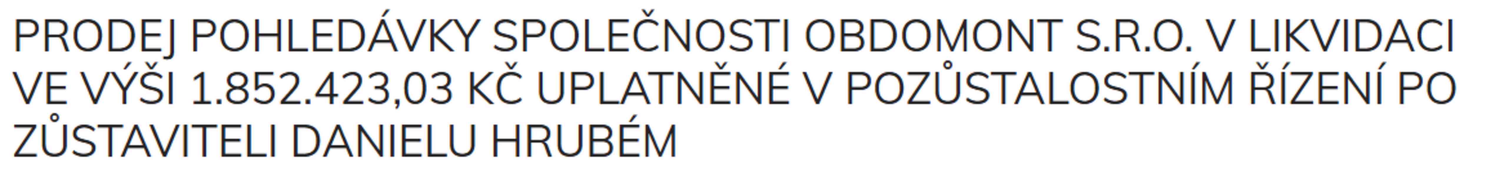 Likvidátorka společnosti OBDOMONT s.r.o. v likvidaci, se sídlem Betonářská 239/10, Muglinov, 712 00 Ostrava, IČ: 014 30 190 nabízí k úplatnému postoupení pohledávku ve výši 1.852.423,03 Kč uplatněnou v pozůstalostním řízení po zůstaviteli Danielu Hrubém, nar. 20.12.1965, zemř. dne 26.08.2019, posledně bytem Porubská 709/14, Ostrava – Poruba. Jedná se o pohledávku z důvodu bezdůvodného obohacení, která může být sporná co do pravosti, a to i z důvodu jejího promlčení. Likvidátorka tedy nebude odpovídat za vymahatelnost ani dobytnost této pohledávky. Podmínkou uzavření smlouvy o úplatném postoupení je zaplacení úplaty najednou před nabytím účinnosti smlouvy o postoupení pohledávky s tím, že postupitel nebude odpovídat za vady této pohledávky a postupník se této odpovědnosti vzdá, a tedy nabyde pohledávku ve stavu, v jakém se bude nacházet ke dni uzavření smlouvy. Likvidátorka upozorňuje, že pohledávku neuplatnila v soudním či jiném řízení. Nabídky na postoupení s uvedením výše úplaty, nechť jsou adresovány ve lhůtě do 06.11.2025 na emailovou adresu insolvence@hepperova.cz či na adresu likvidátorky Mgr. Ing. Evy Hepperové – Komárovská 2438/13, 746 01 Opava. Likvidátorka upozorňuje, že nebude povinna uzavřít smlouvu o postoupení pohledávky s žádným zájemcem a je oprávněna odmítnout všechny nabídky. Likvidátorka upozorňuje, že pohledávka není doložena žádnými listinami, do kterých by zájemce mohl nahlížet.