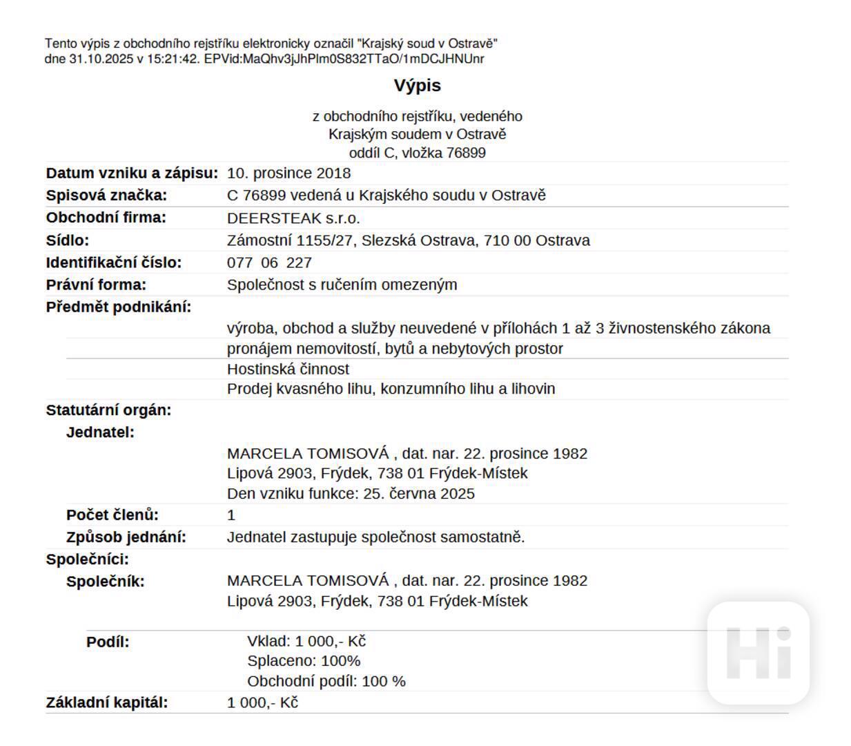 Obchodní podíl ve výši 100 % s vkladem 1.000,- Kč