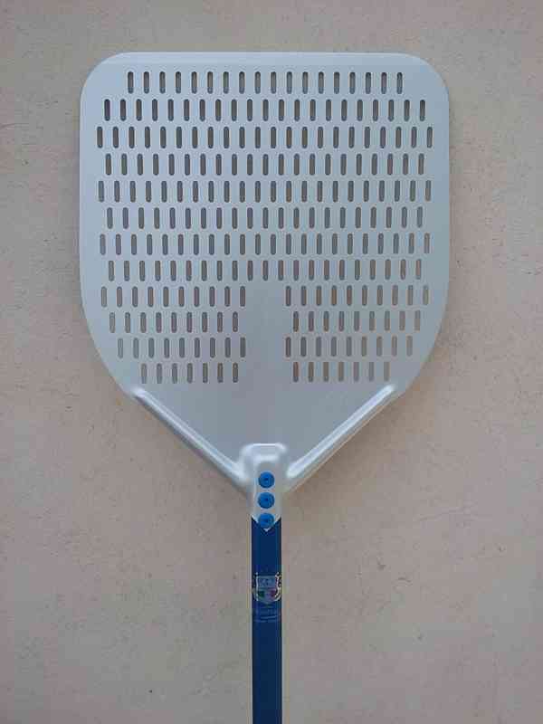 Děrovaná / perforovaná pizza lopata – šířka 33 cm, váha 700 g délka 184 cm, hliníková rukojeť. Výhoda perforované lopaty: je lehčí, propadává přebytečná mouka a nenesete ji do pece. Možné další lopaty 36 cm až 50 cm. Naše cena 2.890,- Kč vč. DPH + doprava. (kód: G560911)