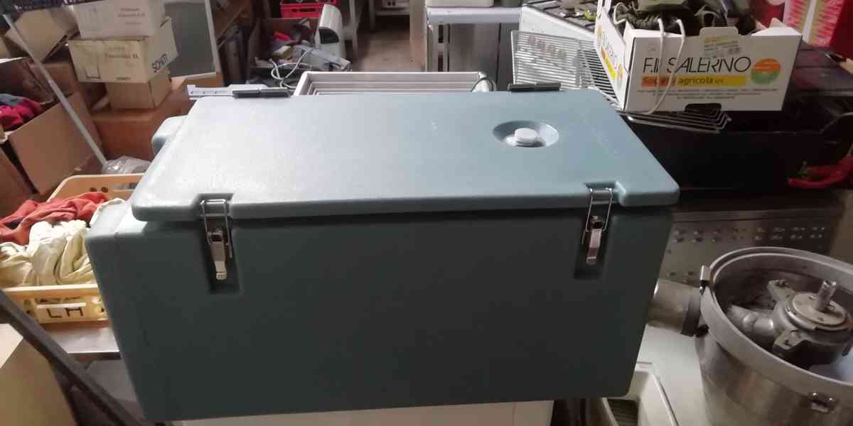Termobox výrobce Cambro, kvalitní izolace, kvalitní těsnění dveří, vrchní madlo na přenos. Vnitřní prostor zaoblené hrany, dveře panty na otevření a dobré zámky na držení dveří, odvětrání. Nebylo použité, vhodné na převoz potravin nebo ledu, atd.. Rozměr ŠxVxD: 330 x 330 x 660 + 60 mm madlo; rozměr vnitřní 270 x 260 x 540 mm. Výprodejová cena 2.990,- Kč. (kód: D0619-45)