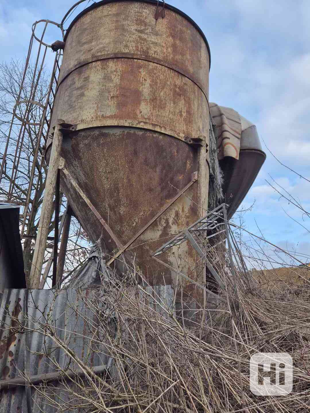 Ocelový zásobník původně na krmivo pro zvířata,nyní cyklon u tryskárny, objem cca 7 m3.