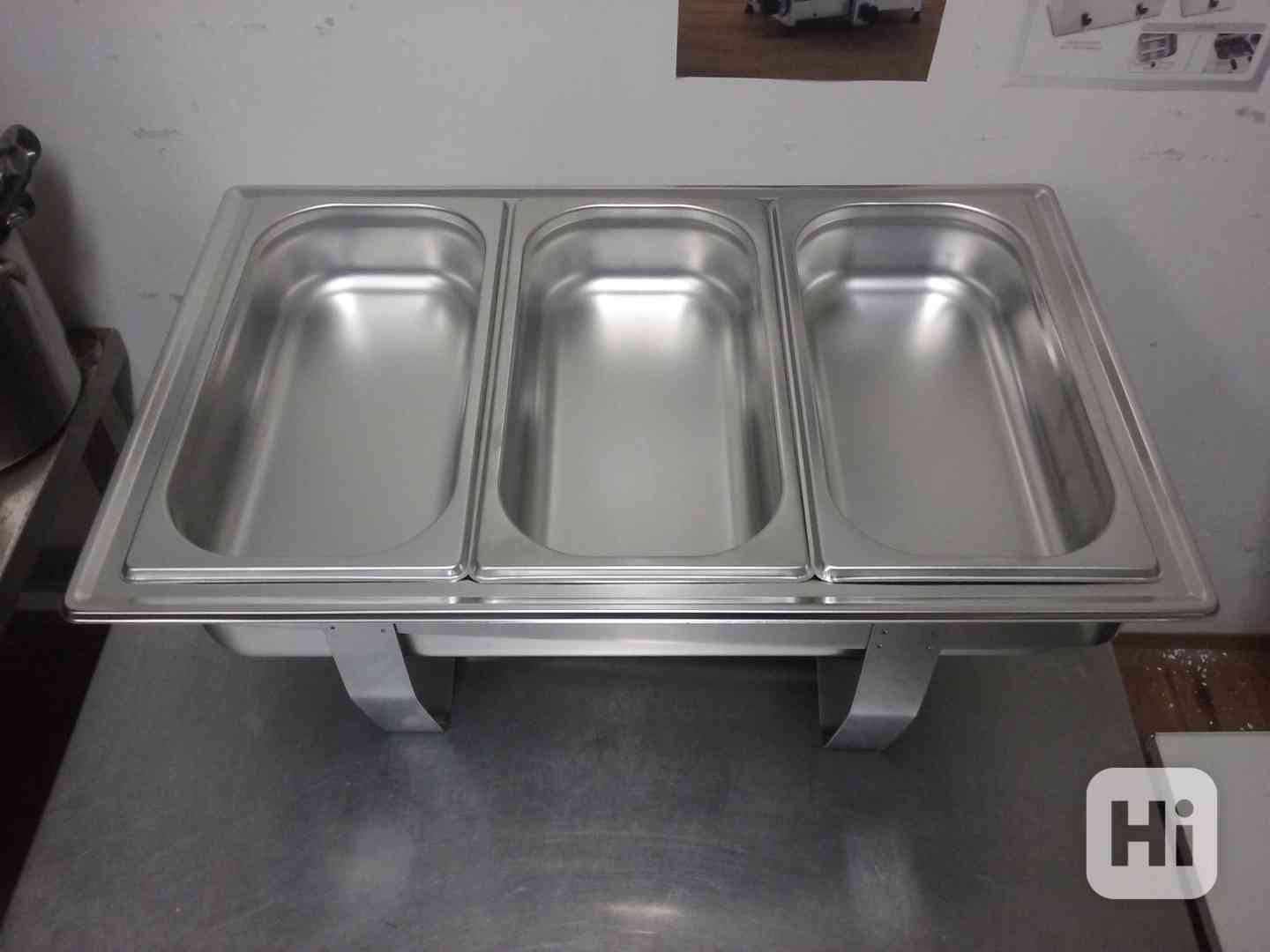 Chafing Dish na rauty, oslavy, catering - sestava: 3 x gastro nádoba 1/3, nádoba na palivo, 1 litr gel. Jednoduchý a moderní chafing dish EKO; rozměr DxŠxH: 60,5 x 36 x 24 cm, obsah 3 x 2,5 litry; další možnosti na vyžádání. Cena: 1.690,- Kč vč. DPH + doprava. (kód: S436110-3P)