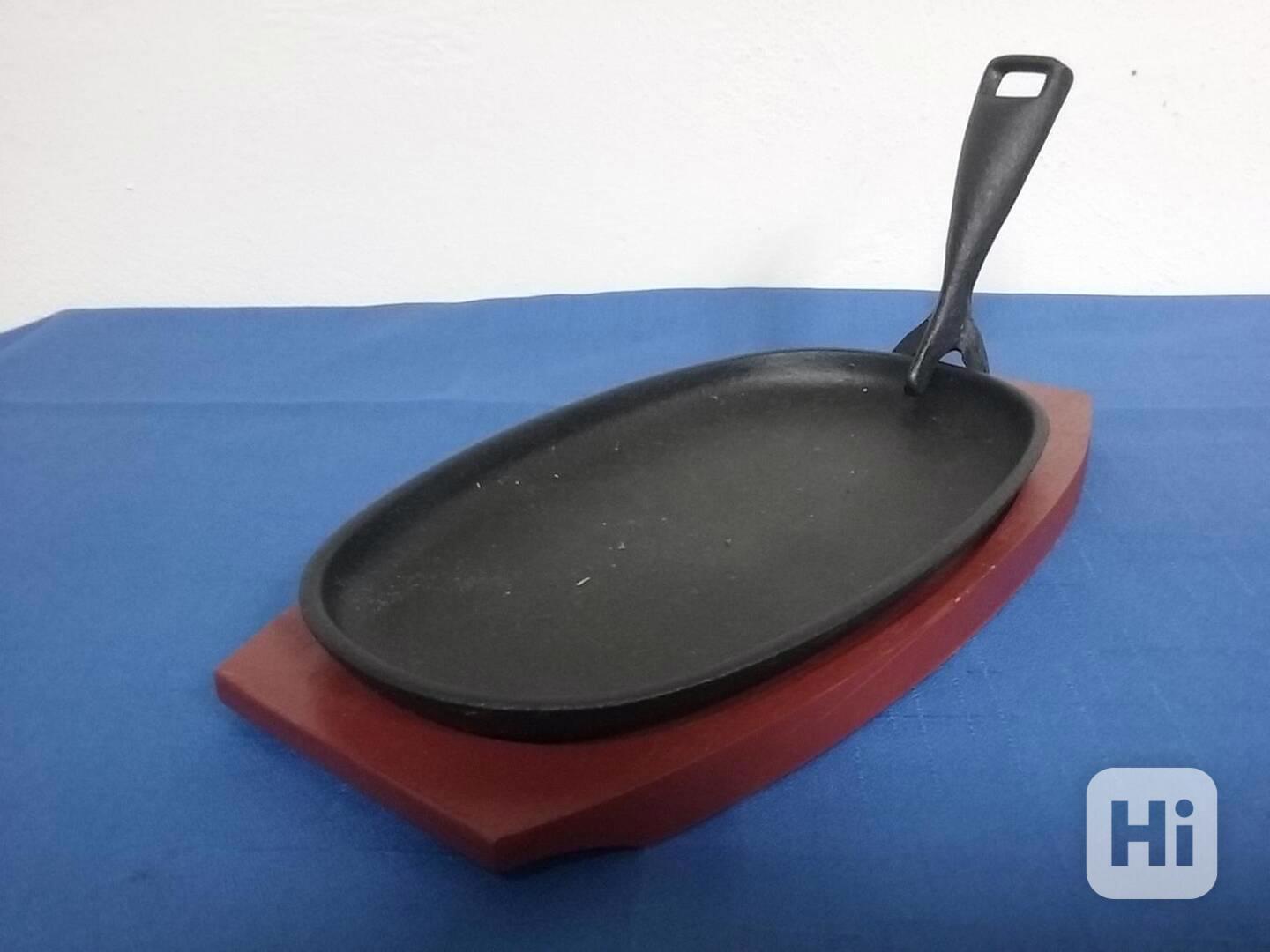 Litinová pánev servírovací s dřevěnou deskou. Litina velmi dobře vede a udržuje teplo, na pánvi možná příprava, ale i servírování. Úchyt na přenášení je odnímatelný, aby se nepřehříval. Dřevěná deska rozměr 28 x 12 cm, pánev 24 x 14 x 2,5 cm, váha 1,1 Kg. Více možností na vyžádání. Cena: 390,- Kč vč. DPH + doprava. (kód: S049004)