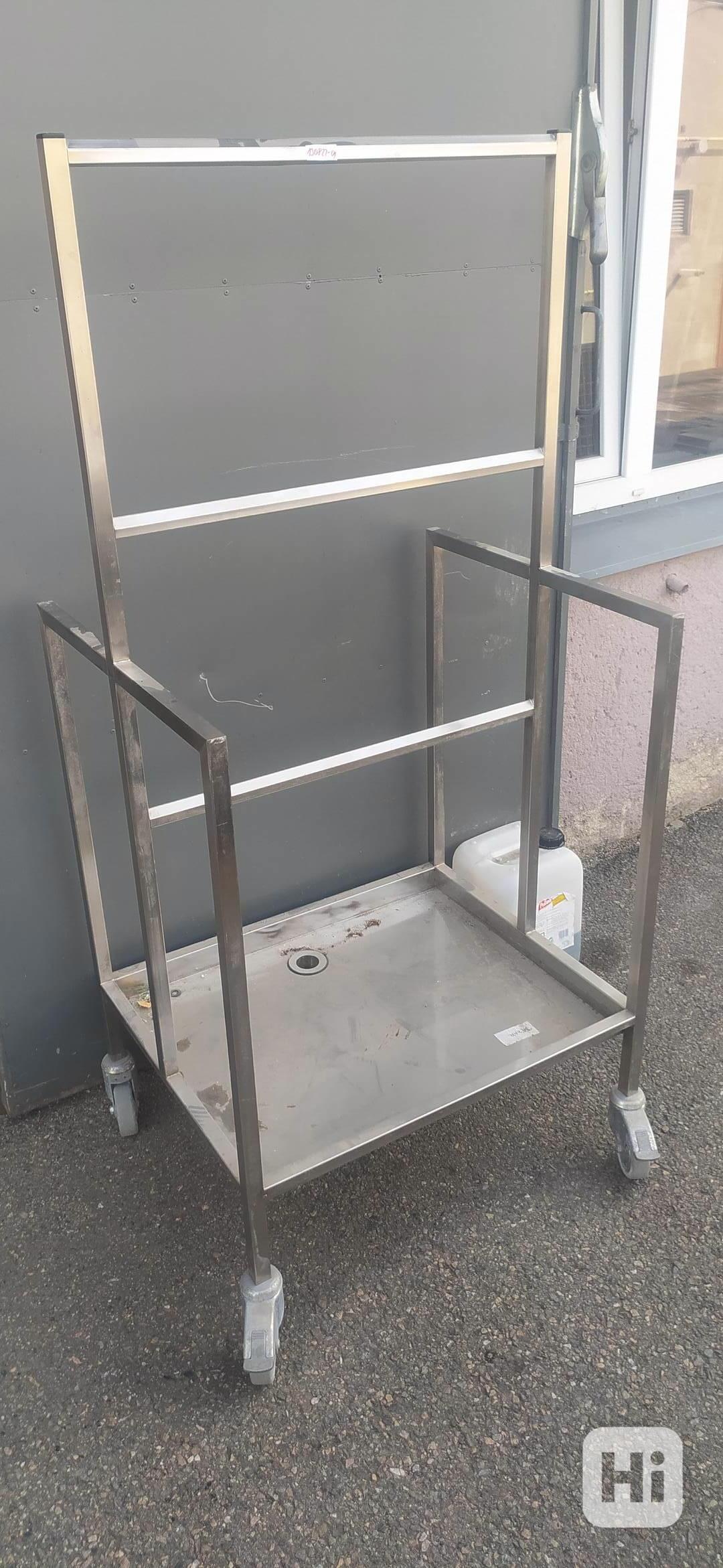 Vozík do řeznictví a kuchyně, na klobásy, párky, salámy, sýry, atd., vhodné do výroby na uzení, zrání, atd.. Rozměr 730 x 600 x 1590 mm, tři patra na zavěšení, materiál nerez, spodní police s okrajem a otvorem pro odtok tekutin. Vozík má 4 x kolečka, 2 x klasická a 2 x s brzdou; nepoužité, z výstavy. Cena: 4.950,- Kč + doprava. (kód: 130222-01)