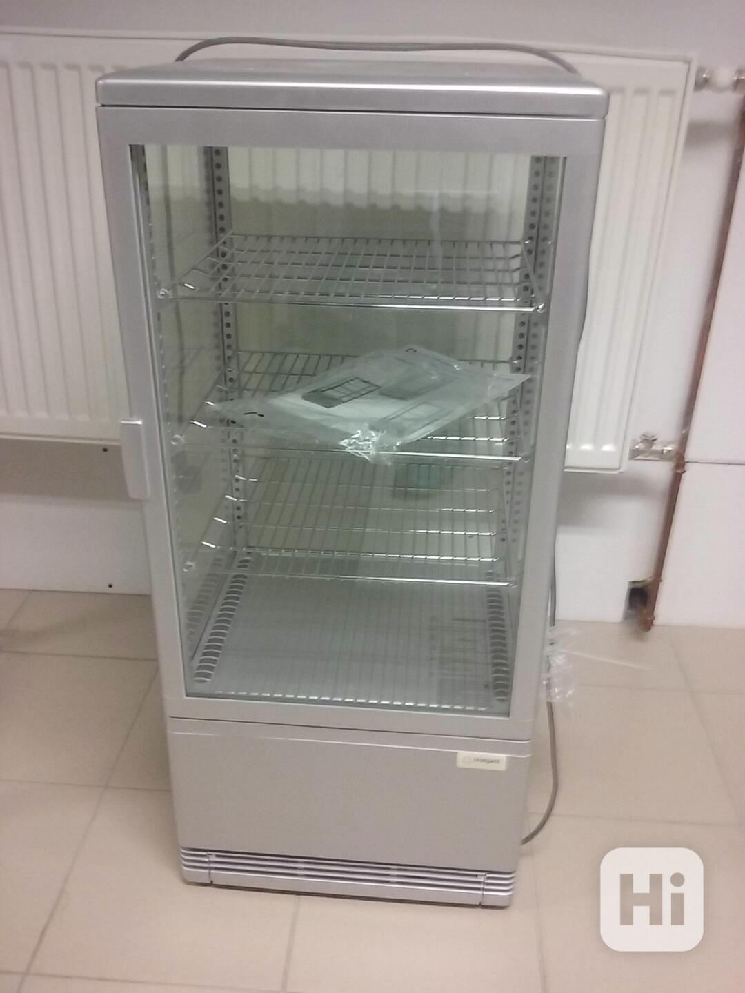 Universální vitrína EKO obsah 78 litrů, barva stříbrná, prosklená ze 4 stran, 3 police + dno. Rozměr ŠxHxV: 428 x 386 x 960 mm, teplota: +2°C až +10°C, výkon 160 W / 230 V, manuální termostat, neonové osvětlení (LED osvětlení na vyžádání). Cirkulační chlazení, dvojité sklo, vhodné na dorty, zákusky, lahůdky, restaurace, cukrárna, bar, hotel, pension atd.. Barevné provedení – bílá, černá, stříbrná, možno barevné a designové provedení folie (za příplatek). Cena: 11.990,- Kč vč. DPH + doprava. (kód: S852172)