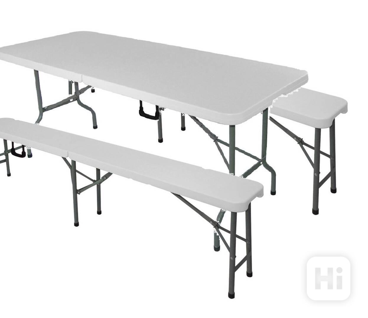 Cateringový nábytek set 1 stůl a 2 lavice – rozložení, složení. Vhodné nejen na catering, ale i zahrádku, kempování atd., tam, kde potřebujete rychle rozložit a složit a šetřit místem. Kovový rám, tvrzený odolný plast, rozměr: rozložený stůl 184x75x74 cm, lavice 182x25x435 cm. Možno i samostatně, výhodný set: 5.990,- Kč + doprava. (S950118-20)