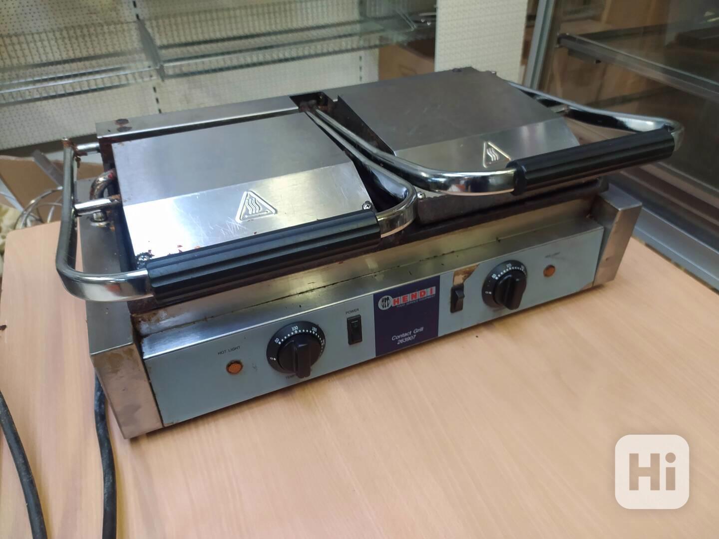Kontaktní gril dvojitý Hendi – Holandsko typ: 263907; plocha rýhovaná / hladká. Gril profesionální z malého bistra, použitý, funkční, nerezové tělo, grilovací plocha litinová. Rozměr ŠxHxV: 570 x 360 x 230 mm; rozměr plochy 2 x 215 x 210 mm; výkon 3,6 kW / 230 V. Původní cena 8.990,- Kč, bazarová cena: 5.990,- Kč. (kód: 111120-02)