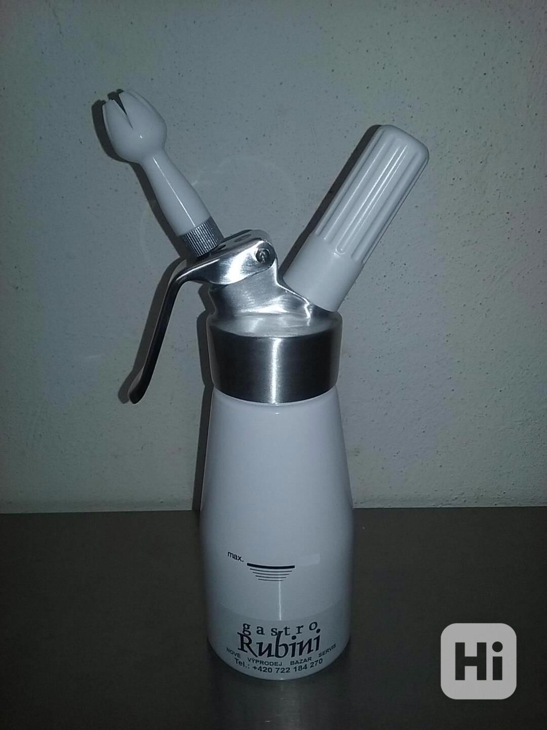 Láhev na čerstvou šlehačku, už žádný sprej – láhev na šlehačku s obsahem 0,25 litru. Výška láhve 200 mm, průměr láhve 80 mm, tři trysky a kartáček na čištění v balení. V nabídce tři modely: 0,25 L / 0,5 L / 1 L; info na vyžádání. Cena: Kč 1.119,- vč. DPH a doprava. (kód: H588031)