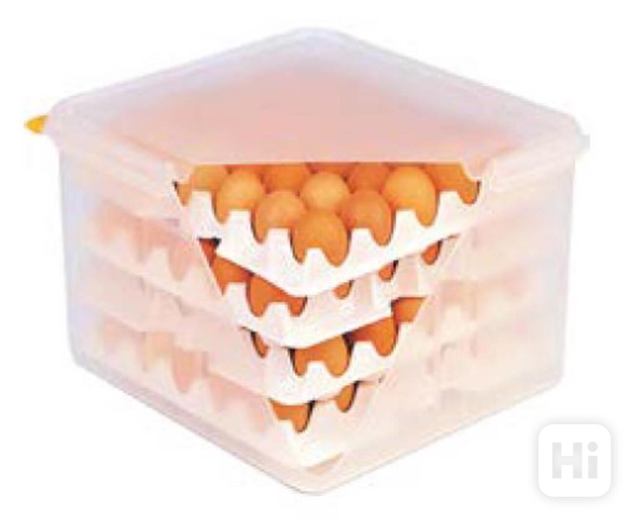 Nádoba na uskladnění vajec a to bezpečné uskladnění vajec mezi ostatní potraviny. Nádoba na 4 podnosy + 8 podnosů na vejce; 1 podnos = 30 vajec; rozměr 354 x 325 x 200 mm; stohovatelné; vhodné do myčky nádobí. Cena: 1.200,- Kč + doprava. (kód: S061500)